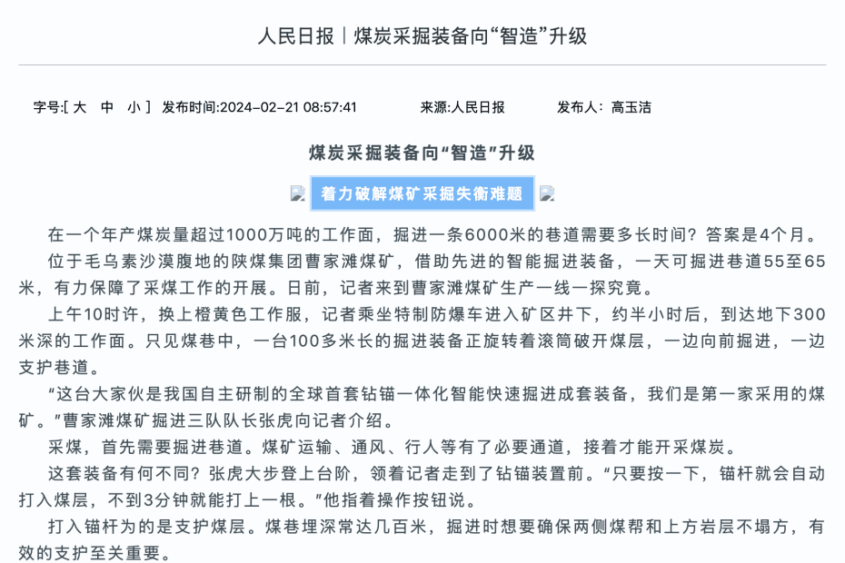 人民日报|煤炭采掘装备向“智造”升级