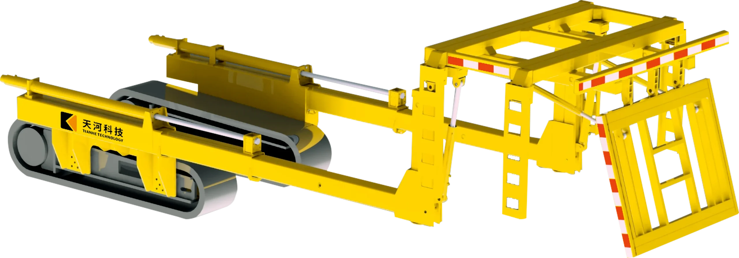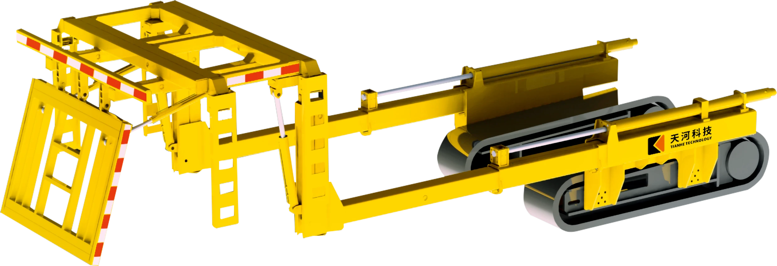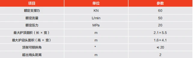 全断面机载临时支护装置安装在掘进机行走部两侧,收回状态与截割部互不干涉。采用三级伸缩梁实现支护顶架的前后移动操作,超出掘进机炮头距离最大可达 2 米。支护顶架具有前伸、侧伸、前护帮、侧护帮等功能,支护面积大,支撑强度高,显著提高支护作业安全性。