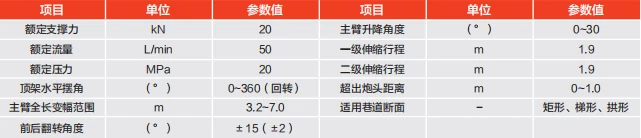 2. 采用单主臂三级升降机构,主臂伸缩行程为 3.8m,可超出炮头 1m 进行支护。