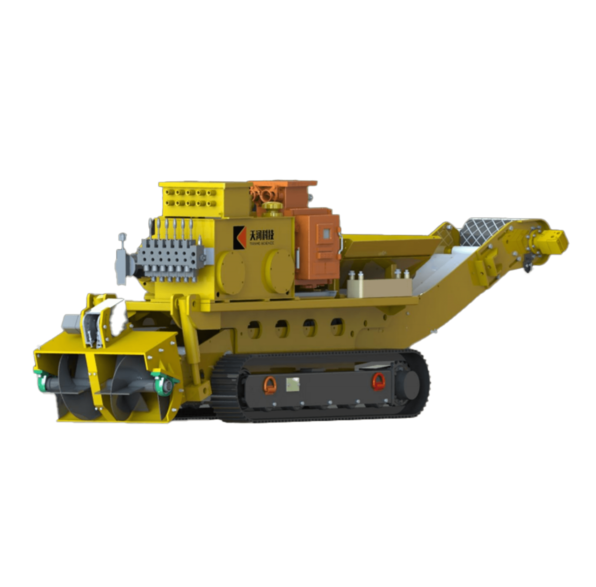 1. 行走取料:通过履带行走和铲斗螺旋主轴的旋转实现拨料取料。